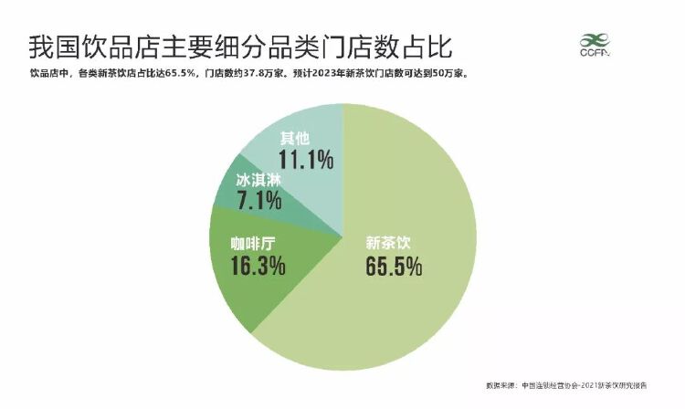 从茶与咖啡的门店占比来看:新茶饮店占比65.5%,门店数约37.8万家,预计2023年新茶饮门店数可达到50万家;咖啡厅占比16.3%,门店数约9.7万家。