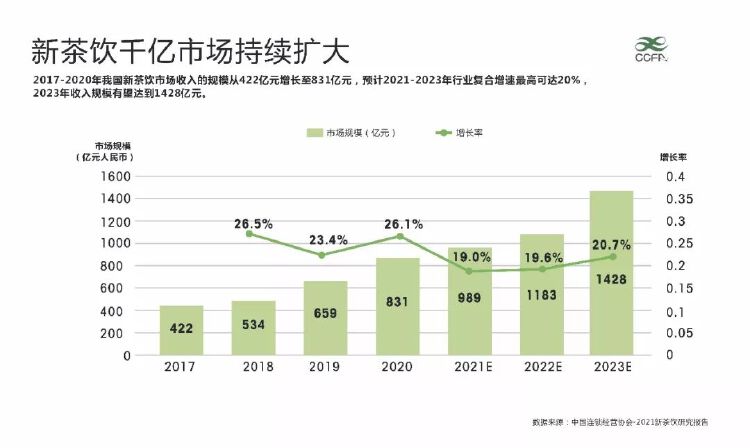 根据《报告》数据显示,2017~2020年,我国新茶饮市场收入的规模从422亿元增长至831亿元,预计2023年有望达到1428亿元。