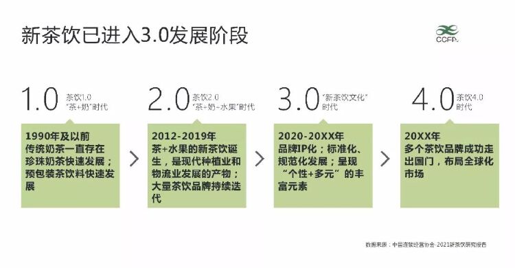 茶饮2.0“茶+奶+水果”时代,主要在2012年-2019年,即新茶饮诞生阶段,大量茶饮品牌持续迭代;茶饮3.0“茶+奶+水果+文化”时代,这也就是目前新茶饮所处的发展阶段——资本推动行业进一步快速发展,疫情加速行业洗牌,供应链的发展、人才的涌入、数字化运营建设都成了品牌发展的关键性因素;茶饮4.0时代,即未来多个茶饮品牌成功走出国门,布局全球化市场。