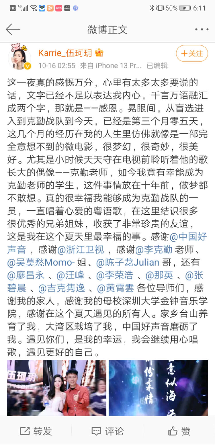夺冠后,10月16日凌晨2:55,珂玥发出了微博,感谢导师、家人、母校和家乡。“昨晚真的感觉很不真实,这个夏天都像一场梦一样。”珂玥说,直到今天早上睡醒后,看到微信里五六百条祝贺信息,微博上100万加的阅读量、满满的私信,还有沉甸甸的奖杯……才感觉原来这一切是真实的发生。