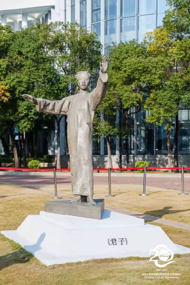 1914年11月5日,梁启超先生应邀在清华同方部做题为《君子》的演讲。在演讲中,梁先生引用《周易》里“乾”“坤”二卦,来探讨“君子”的含义;2021年12月12日,演讲中慷慨激昂的梁启超“出现”在清华大学深圳国际研究生院C楼东南草坪。当天,清华大学深圳国际研究生院举行《君子》雕像揭幕仪式,这也是清华大学深圳国际研究生院二十周年庆典系列活动之一。