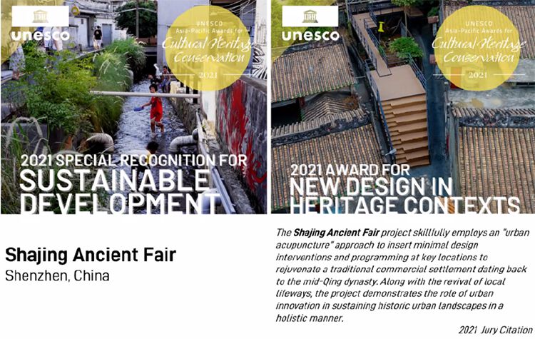 日前,2021年联合国教科文组织亚太地区文化遗产保护奖(以下简称“UNESCO亚太遗产奖”)正式公布,由深圳大学建筑与城市规划学院研究员、本原设计研究中心副主任、趣城工作室创始人张宇星博士,与趣城工作室联合创始人韩晶博士共同主持的深圳沙井古墟新生项目同时荣获两项大奖:遗产文脉下的新设计奖和可持续发展特別认可奖。