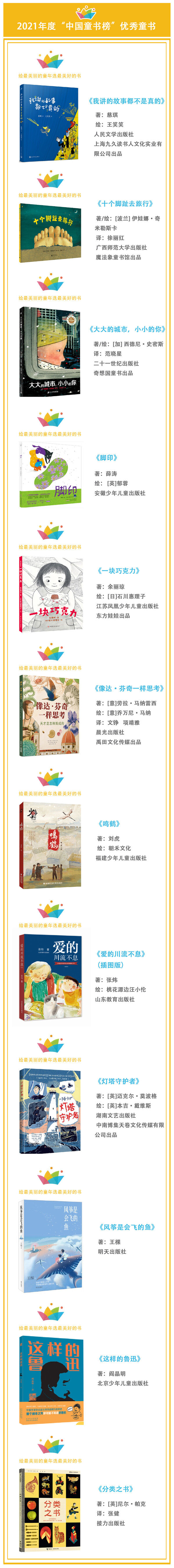 其中,《迷路的小孩 》《大象的旅程》《喜鹊窝》等12种童书获年度“最佳童书”奖,《我讲的故事都不是真的》《十个脚趾去旅行》《大大的城市,小小的你》等12种童书获年度“优秀童书”称号。《中国轨道号》《外公教我学诗词》《为什么?100位哲学家的哲思故事》等100种童书入选2021年度“中国童书榜”百佳书单。
