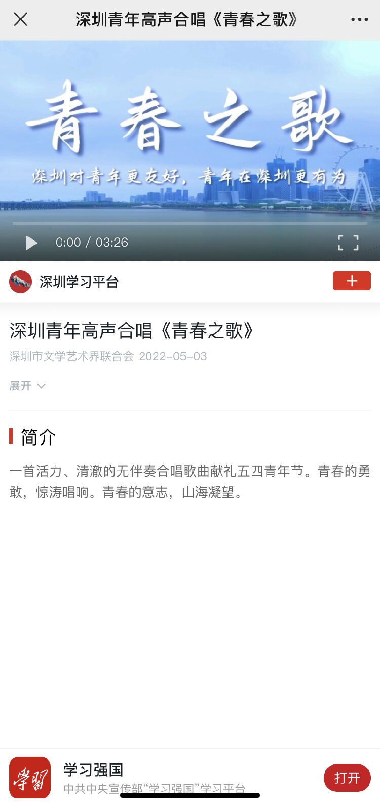 今年是建团百年,“创作团长“王芳又被团市委委以重任。在五四青年节前,这首《青春之歌》终于完成了录音和视频制作,4月30日由深圳市文联率先发布后,就被学习强国的“广东音乐”选中推荐发布,未几,不常推荐原创文艺作品的《深圳发布》也发了歌曲视频,同行赞王芳创作太给力。话音刚落,“深圳青年高声合唱《青春之歌》”这个视频就登上了学习强国总台。