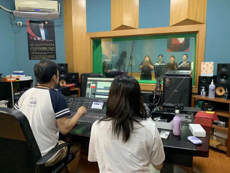 第一次录音是4月15日,20个女声合唱的同声作品。一开始录音没有分声部录,常任指挥谢英彬老师指挥着十八位女唱将合唱,整整一下午六个小时,录了十几遍,作为十八人版效果已经很不错,但却不能彰显作曲家设定的“50+”团员演唱的大作品意图。而当时歌剧舞剧院正要进入深圳第一部歌剧《先行者》的排练期,时间紧,任务重,接下来很可能要封闭排练。留给她们的录音的时间不多。王芳说,通过这次录音,她又搞清楚很多作曲的专有名词。