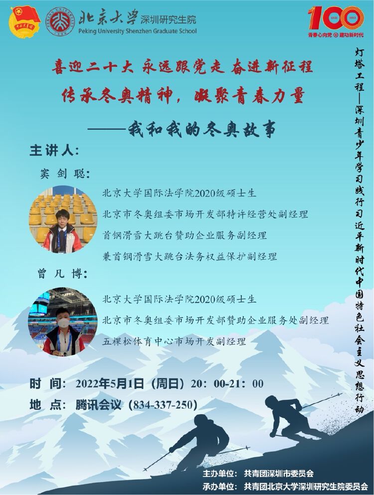 5月1日晚,由共青团深圳市委员会主办,共青团北京大学深圳研究生院委员会承办的灯塔工程系列活动之“传承冬奥精神,凝聚青春力量——我和我的冬奥故事”讲座以腾讯会议的形式在线上成功举办,本次活动的主讲人是来自北京大学深圳研究生院国际法学院2020级的窦剑聪和曾凡博两位同学。