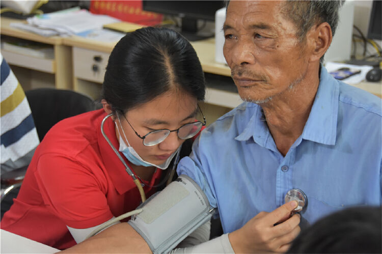 8月17日,实践团队开展以“关注H型高血压,精准防控脑中风”为主题的义诊服务。团队成员前期经过多次H型高血压知识的线上培训,对其危害以及如何科学预防脑卒中进行了系统学习。在专业医师的指导下,给当地居民免费进行测量血压,开展H型高血压科普知识讲解活动,并告诉村民如何科学有效的预防脑卒中的发生。医护学院的李泽璇同学表示:“要想让村民们有意识地去预防患高血压,实在是太艰难了!有幸能用上我学到的专业技能为当地村民带来一点微光,我感到非常自豪。”