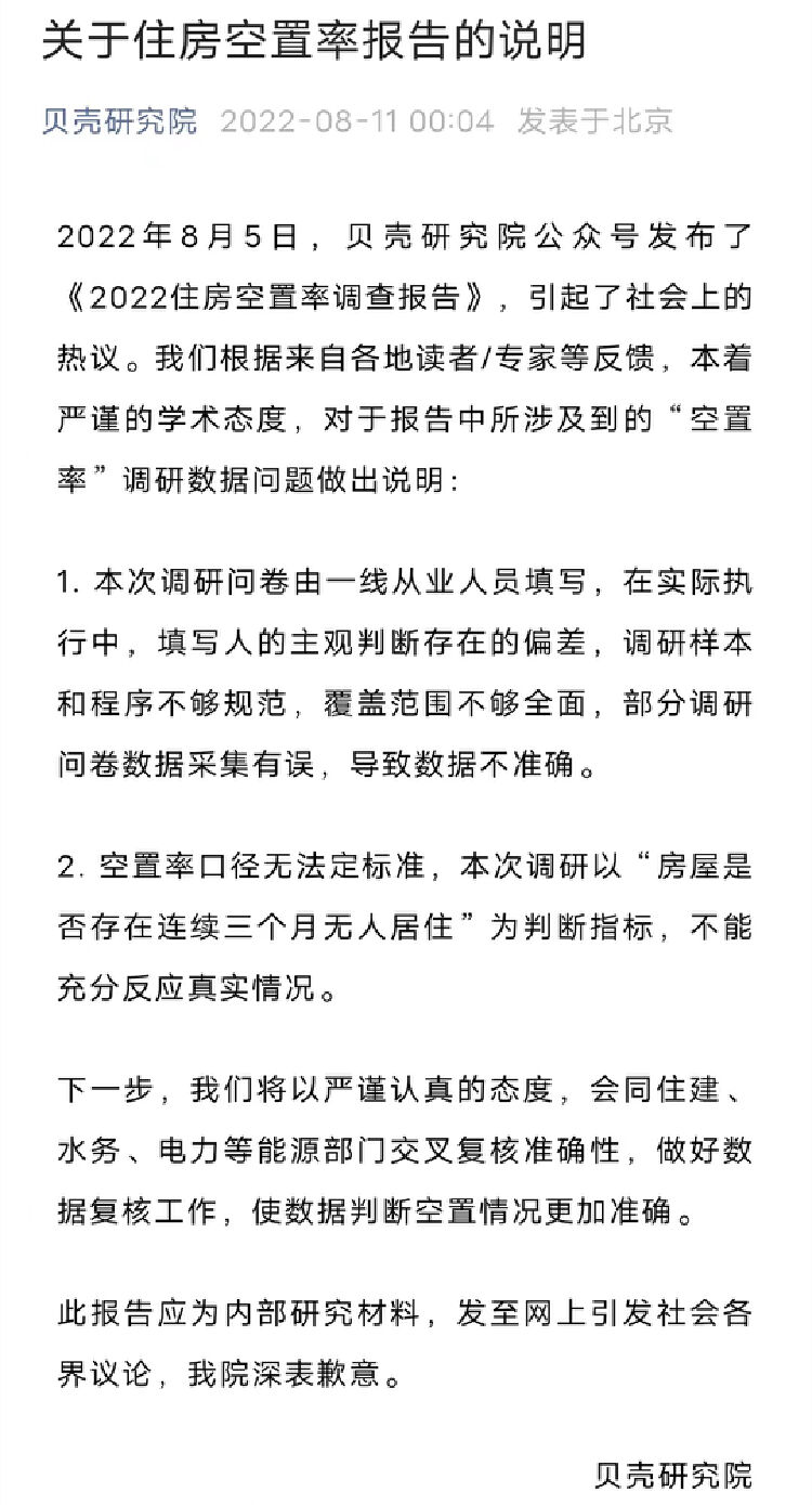 贝壳研究院表示,此报告为内部研究材料,发至网上引发社会各界议论,为此深表歉意。
