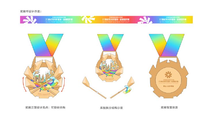 值得一提的是,联赛奖牌设计极具创意,采用“静态+动态”的设计,通过创意手法展现湾区科教奋发有为的精神气质、朝气蓬勃的青春面貌:深圳地标性建筑前,赛艇穿过多条色带的汇集奋力前行,在一抹科技蓝中绽放出多彩活力。“动态”是奖牌设计的最大亮点,奖牌正面为可旋转结构,浆板为可拆分结构,突破了传统奖牌的静态结构,十分新颖有趣。