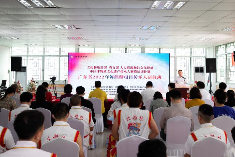 “让传承人对舞麒麟项目讲得清楚、舞得精彩、传得自信!”11月12日,深圳职业技术学院(以下简称“深职院”)2022年舞麒麟项目传承人研修班正式开班。来自国家级非物质文化遗产大船坑舞麒麟项目的20名传承人齐聚龙华区大浪麒麟博物馆,重回课堂。他们将通过一个月的系统学习,强基础、拓眼界、增学养,进一步提升非遗保护传承水平。