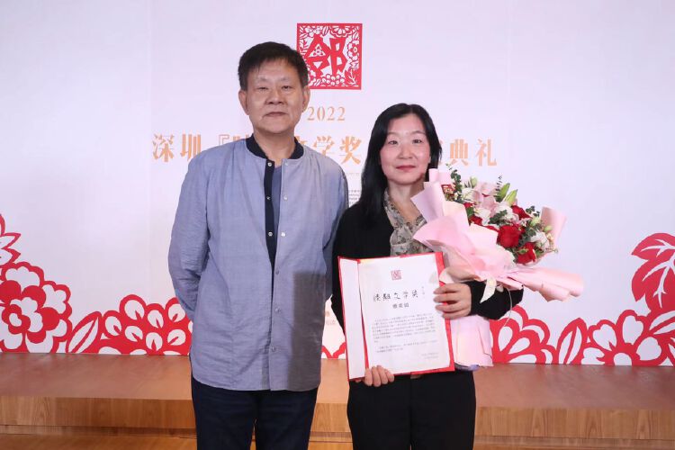 ▲邓一光为深圳“睦邻文学奖”年度大奖得主陈末颁奖