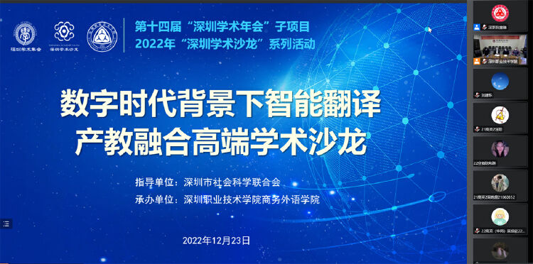 日前,由深圳市社会科学联合会指导、深圳职业技术学院商务外语学院承办的“数字时代背景下智能翻译产教融合”高端学术沙龙在云端召开,吸引到300多位专家、师生参会。