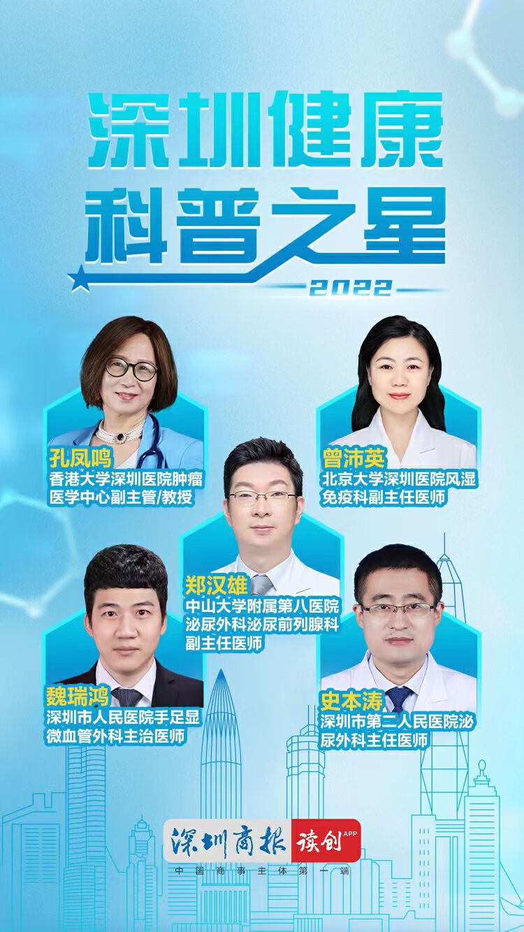 谁最能称得上是2022年的健康科普界“顶流”?经过百万人次网友亲自票选后,12月27日,由深圳商报/读创、深派健康主办的2022年“第三届深圳健康科普之星”评选结果正式出炉,五名来自深圳不同医院不同科室的医生成为优胜者,获评为“2022深圳健康科普之星”。