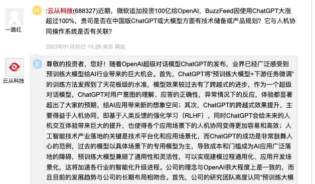 近日,记者注意到,由于ChatGPT概念股持续火爆,股价大幅飙升,投资者纷纷在互动平台上询问相关公司是否涉人工智能产品或相关技术储备,多家上市公司也对此进行了回应。