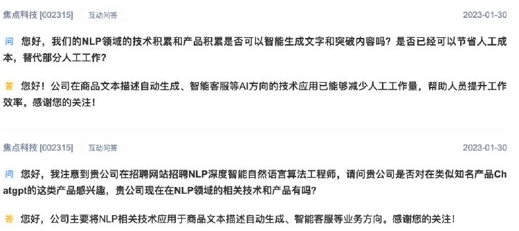 焦点科技在互动平台表示,公司目前尚未应用ChatGPT,但公司在商品文本描述自动生成、智能客服等业务方向运用了AIGC相关技术。公司将持续研究并利用ChatGPT等最新技术,以不断拓展公司业务与技术边界。