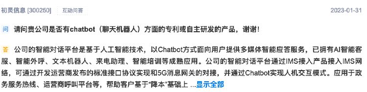 1月31日,初灵信息在互动平台回应,公司的智能对话平台是基于人工智能技术,以Chatbot(聊天机器人)方式面向用户提供多媒体智能应答服务,已拥有AI智能客服、智能外呼、文本机器人、来电助理、智能培训等成熟应用。