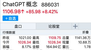 A股市场表现看,从1月30日开始大涨后,2月1日ChatGPT概念延续强势,多只概念股连续涨停。截至2日收盘,ChatGPT概念板块指数报1106.98点,概念股整体涨幅达8.42%,成交约165亿元。