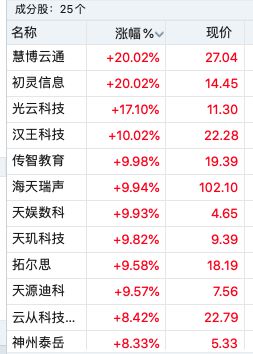 ChatGPT概念板块25只个股全部飘红,其中,涨幅最大的前5只个股为:慧博云通报27.04元,涨20.02%;初灵信息报14.45元,涨20.02%;光云科技报11.30元,涨17.10%;汉王科技报22.28元,涨10.02%;传智教育报19.39元,涨9.98%。