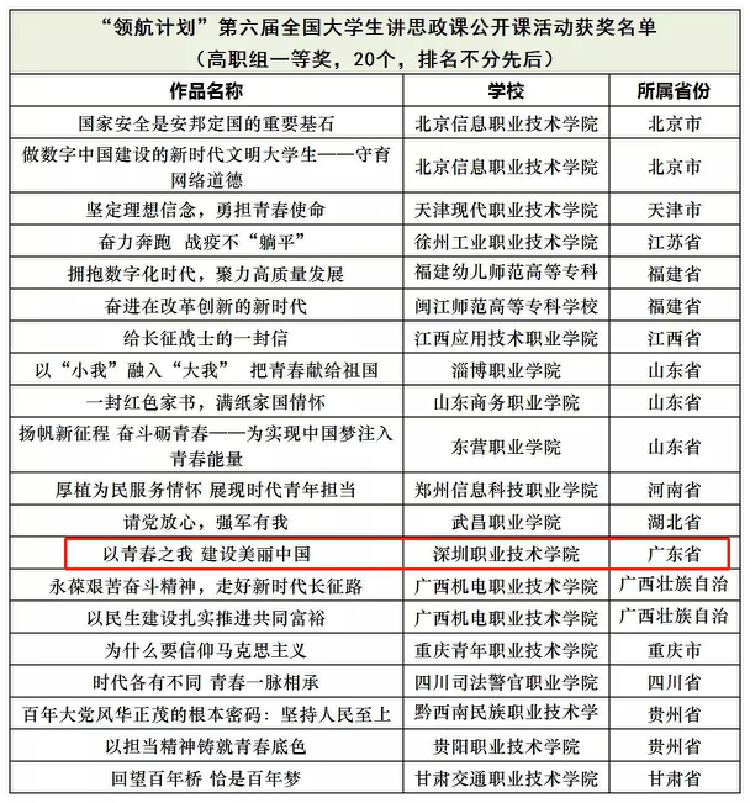 3月30日,第六届全国高校大学生讲思政课公开课展示活动评选揭晓,深圳职业技术学院(以下简称“深职院”)选送的《以青春之我 建设美丽中国》从全国960部作品中脱颖而出,喜获全国一等奖。这是该校连续第三年获得“全国高校大学生讲思政课公开课展示活动”一等奖。