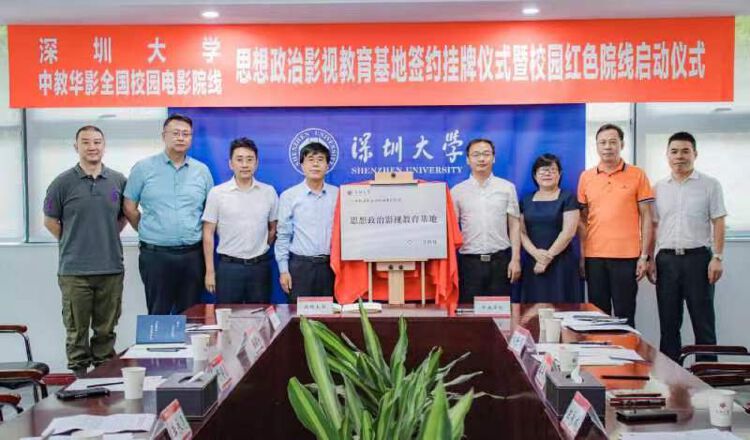 2017年,教育部、新闻出版广电总局联合下发通知,推进建设全国校园电影院线,将校园院线作为加强和改进校园大学生思想政治教育的新方式、新平台。为了深入开展学习贯彻习近平新时代中国特色社会主义思想主题教育,以红色文化丰富校园文化,加强校园思想化阵地和意识形态阵地建设,深圳大学联合全国校园电影院线的运营方中教华影电影院线股份有限公司(以下简称“中教华影”),共同在深圳大学挂牌建立思想政治影视教育基地,共同建设深圳大学校园红色院线。