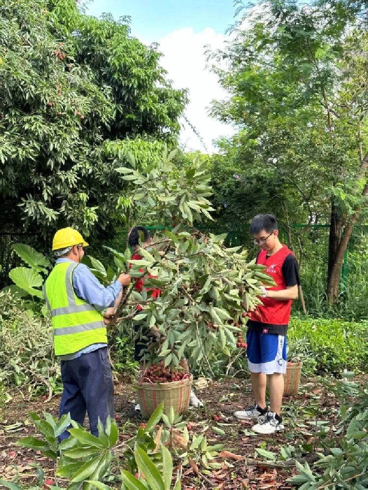 围绕荔枝,深大还组织了生动的“劳动课”。深大后勤保障部联合全校各单位共同开展劳动教育活动,荔枝开摘首日,电子与信息工程学院的学生积极响应,协助园林师傅捡果、剪枝。荔枝派发首日,深圳大学学生会也纷纷加入了派发队伍,亲手将荔枝派发到师生手中。