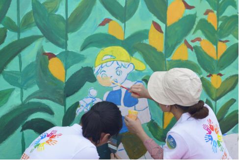 墙绘组主要是对运堂村民议事广场围墙进行墙绘主题设计。从主题设计—打形—描边—填色,同学们在素白的墙面上,用一笔一画勾勒出自己心中最完美的图画。