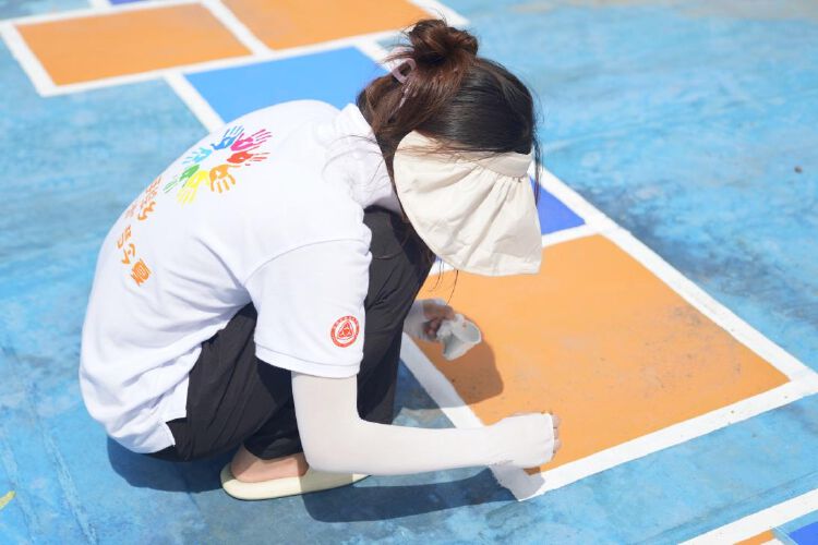 俗话说“差之毫厘,距之千里”,团队成员每一步都保持严谨,杜绝一厘一毫的偏差。“这么大的操场,每一条线、每一个圆都需要测量,徒手绘制,这对我们来说是个挑战。不过,最后我们成功了,满满是收获的喜悦!”涂绘组组长董圣琪说道。最后,团队成员拿起手中的刷子和滚轮,根据描好的形状填上缤纷的色彩。