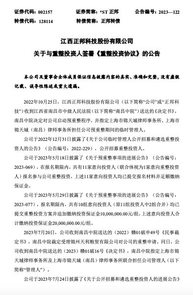 公司于2023年7月24日披露了《关于公开招募和遴选重整投资人的进展公告》(公告编号:2023-107),正邦重整投资人遴选评审委员会根据《正邦系企业重整投资人遴选评审规则及评分细则》依法评审表决,经江西省南昌市新建公证处进行现场监督公证,确认双胞胎信达联合体(牵头投资人:江西双胞胎农业有限公司)为中选投资人。