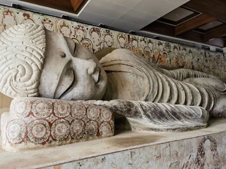第158窟位于莫高窟南端,为吐蕃统治时期所凿,是莫高窟著名的涅梁窟之一。所谓涅梁窟,是将涅架像作为洞窟的主体,前面没有遮挡而使卧佛像赫然横陈在观者面前,所以涅梁窟的平面都作长方形。