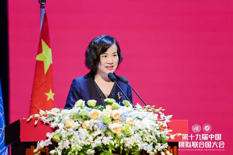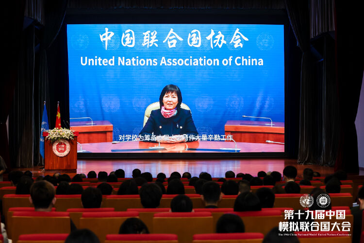开幕式上,中国联合国协会副会长兼总干事胡文丽女士首先进行了视频讲话。胡文丽女士提到,当前国际局势风云变幻,世界秩序面临诸多挑战。正是在这面对世界之变、时代之变、历史之变的时刻,联合国作为世界上最具普遍性、代表性和权威性的政治间国际组织,坚持推进多边主义,为维护世界和平、促进共同发展发挥了不可替代的作用。中国模拟联合国大会自 2004 年首次举办以来,先后有5000 多名青年参与其中,其中不少同学毕业后投身到了外交外事、国际组织工作中。在讲话中,胡文丽对青年们提出了三点期望:树立天下情怀,实现过硬本领,熟悉规则意识。“未来属于青年,青年创造未来,希望广大青年珍惜青春年华,踔厉奋发,为实现中华民族伟大复兴和推动构建人类命运共同体谱写更加壮丽的青春诗篇。”胡文丽在最后说道。