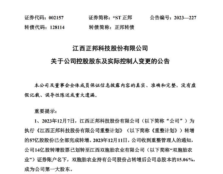 公告显示,2023年12月7日,江西正邦科技股份有限公司为执行《江西正邦科技股份有限公司重整计划》转增的57亿股股份已全部完成转增。2023年12月11日,公司收到重整管理人的通知,公司14亿股转增股票已划转至江西双胞胎农业有限公司(以下简称“双胞胎农业”)证券账户名下,双胞胎农业持有公司股份占转增后公司总股本的15.06%,成为公司第一大股东。