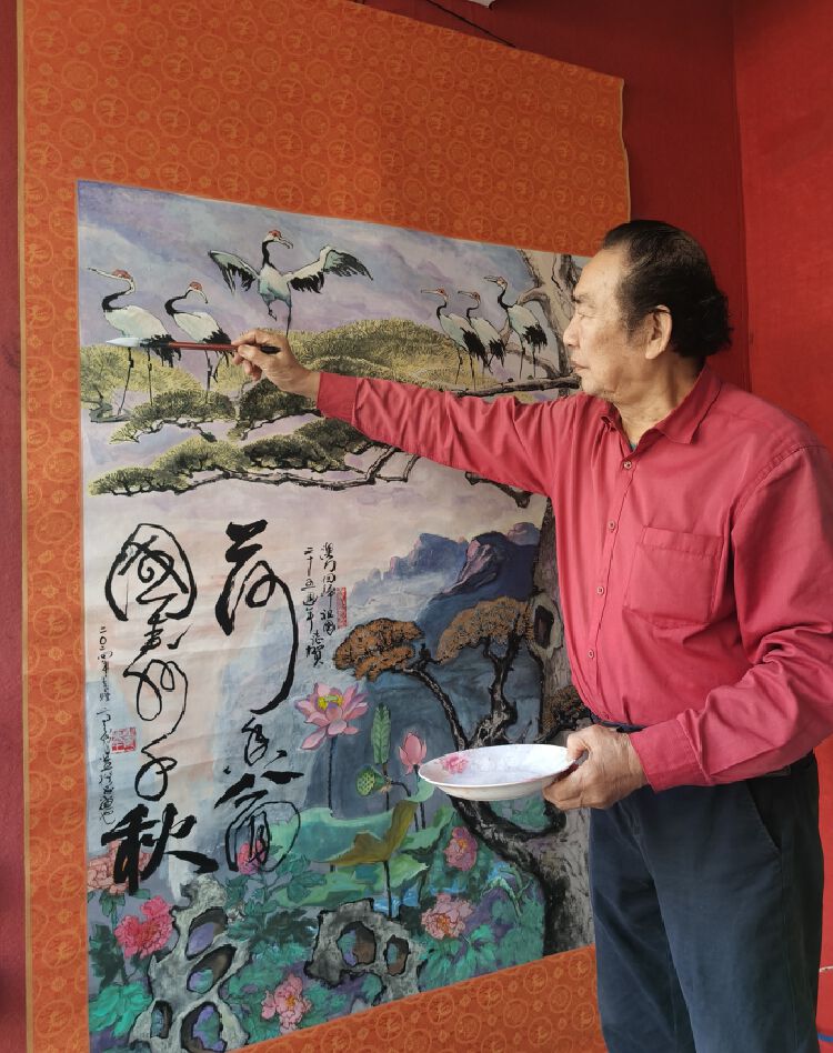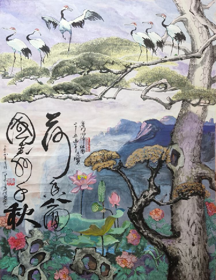 画面上,白鹤振翅飞舞,松树伟岸挺拔,远观天地氤氲,崇山峻岭,近观荷叶清香益远,繁花似锦。