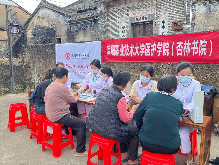 除了文艺演出、公益放映,深职大还组织了义诊活动。在惠东县皇思扬村里的一处小广场上,村民们听闻有大学生在做义诊,纷纷前来。20名医学专业大学生现场为村民免费开展视力检查、血压监测、血糖测量、体脂血氧测量及口腔健康检查,并针对检查结果为村民提供一对一的健康指导。在助老之余,团队成员还向村里的年轻人和小朋友科普急救知识,现场教授心肺复苏术。徐婆婆测完血压血糖后说,“因为行动不便,自己的血压血糖很久没有检测,今天深职大的孩子们送医下乡,来到我们身边检测,实在太方便了。”
