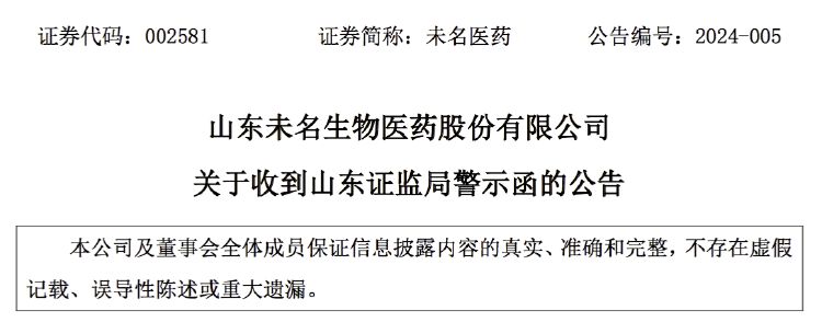 未名医药2月2日发布公告称,公司于近期收到中国证券监督管理委员会山东监管局《关于对山东未名生物医药股份有限公司及相关人员采取出具警示函措施的决定》。