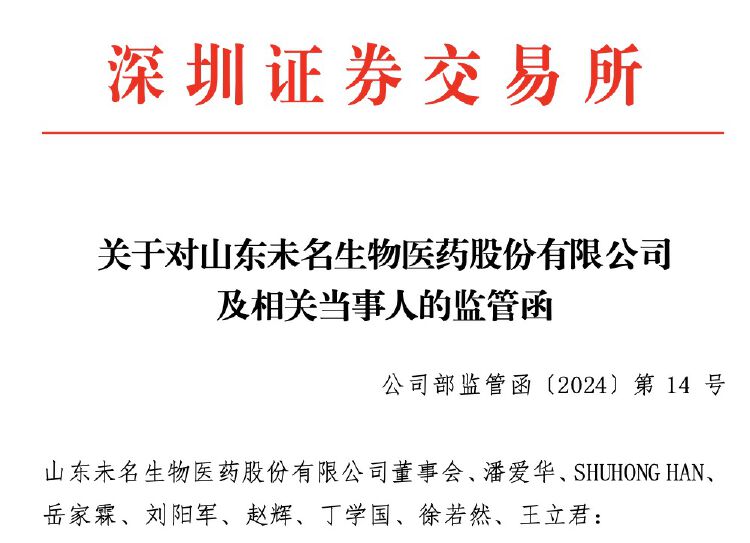 此外,因未按规定披露关联方资金往来、未按规定披露对外担保,深交所2月2日对未名医药及相关当事人发监管函。