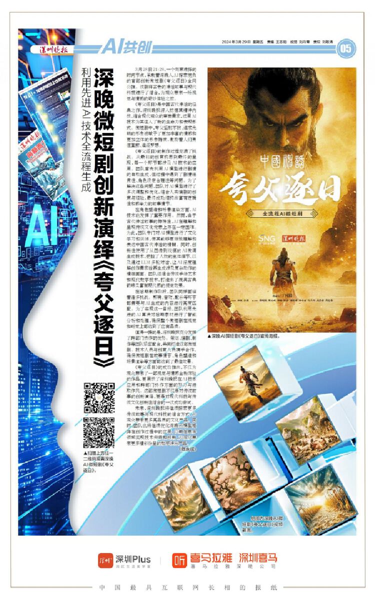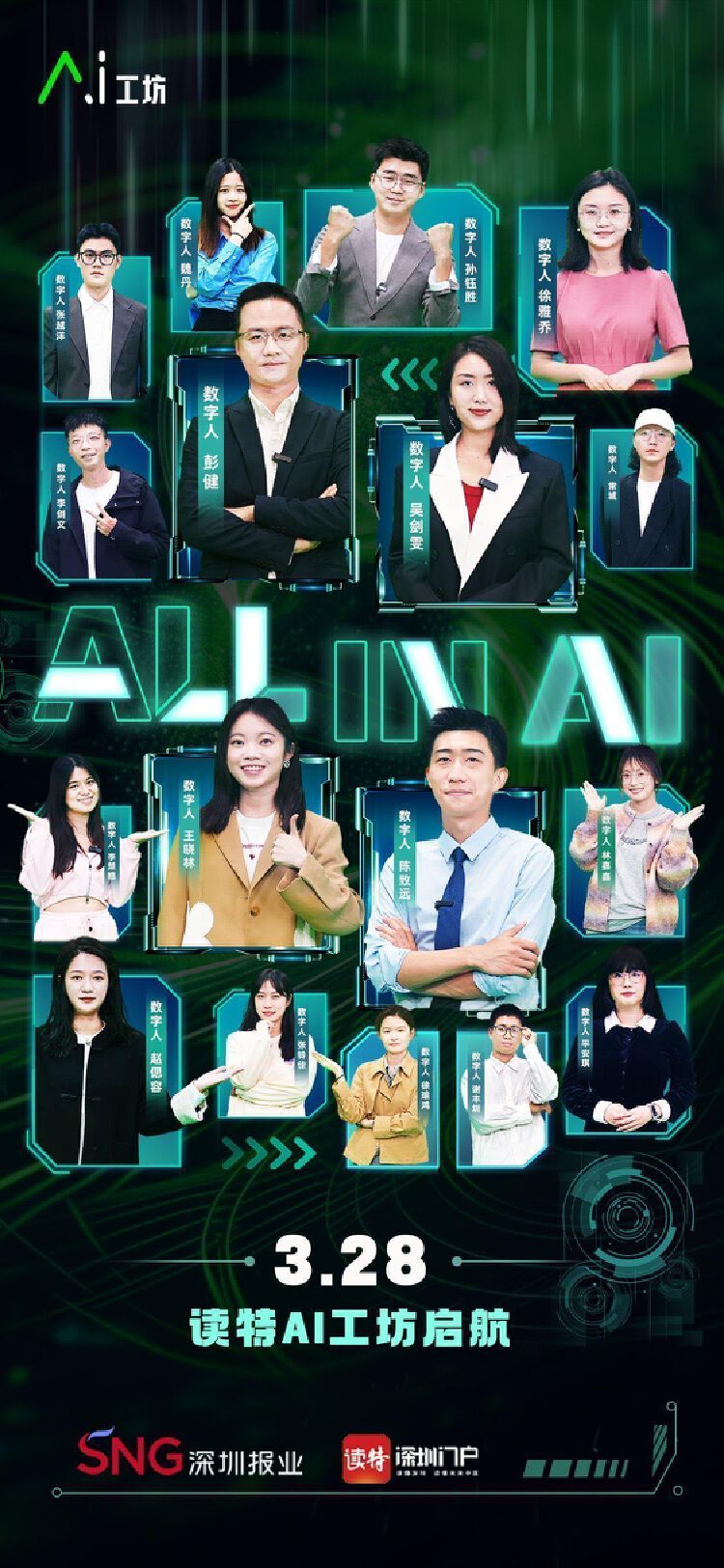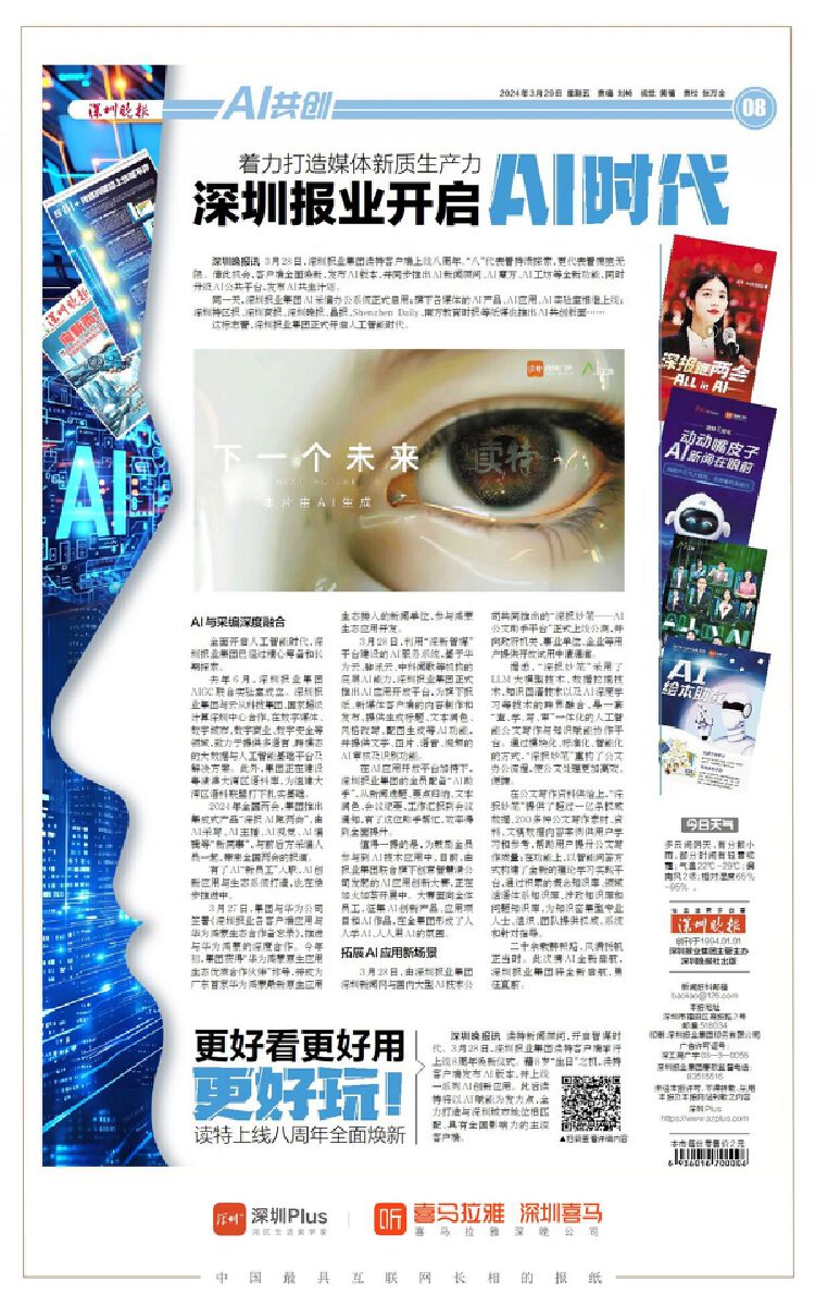 同一天,深圳报业集团AI采编办公系统正式启用;旗下各媒体的AI产品、AI应用、AI实验室相继上线;深圳特区报、深圳商报、深圳晚报、晶报、Shenzhen Daily、南方教育时报等纸媒也推出AI共创版面……