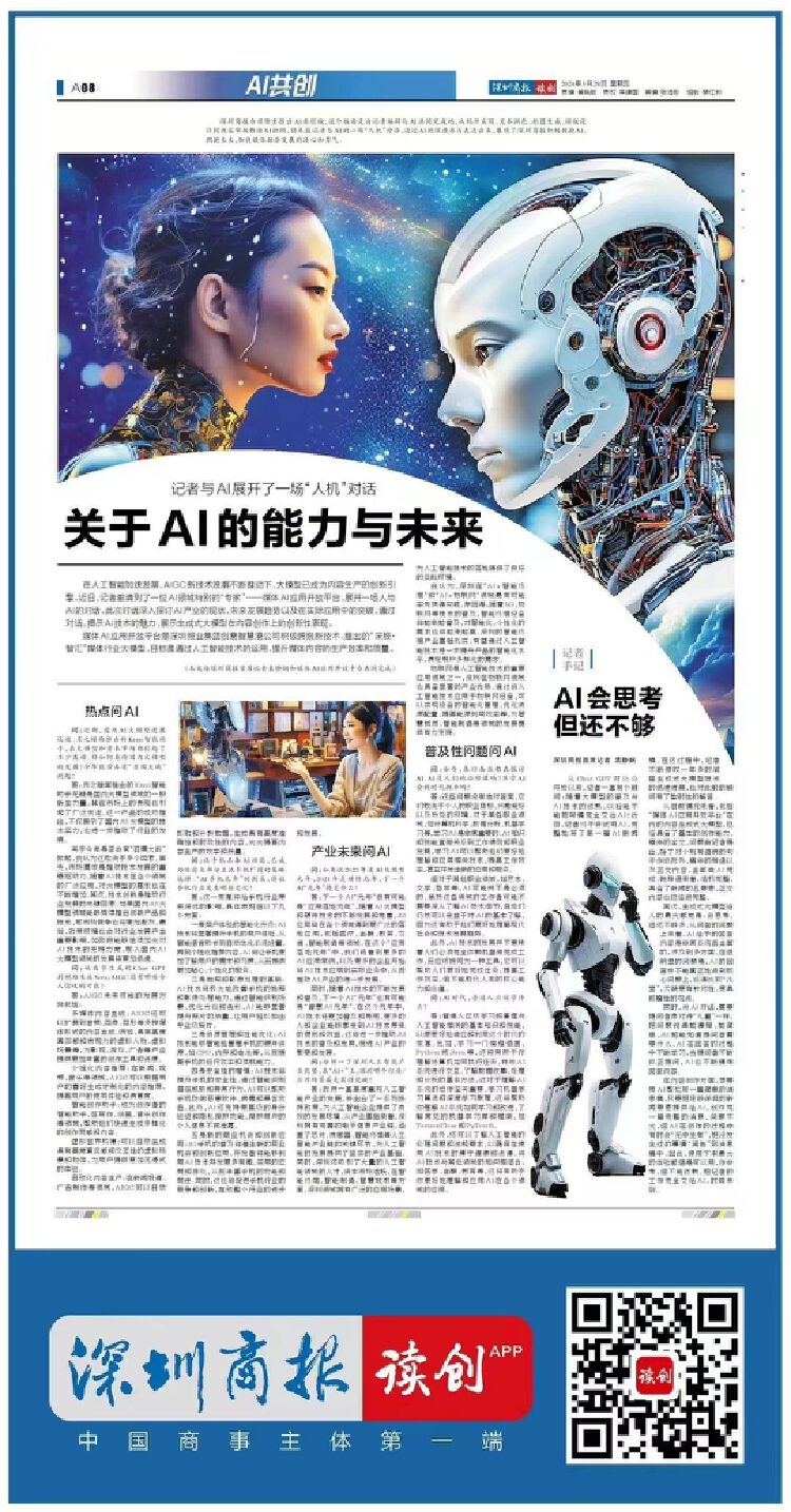 深圳商报明天在8版隆重推出首个AI版《关于AI的能力与未来》,版面是由记者编辑与AI共同完成,从稿件采写、文本润色、配图生成、排版设计到内容审核都由AI担纲,将本报记者与AI的一场“人机”对话,通过AI的深度参与表达出来,展现了深圳商报积极拥抱AI、拥抱未来,加快媒体融合发展的决心和勇气。