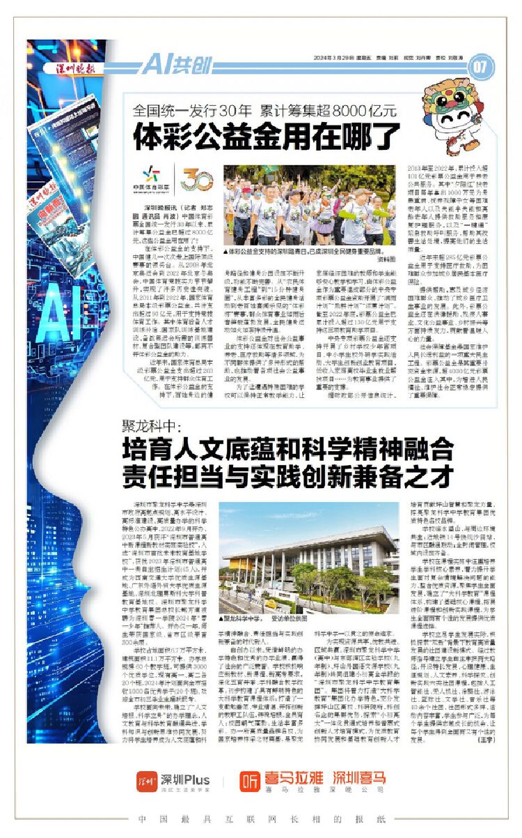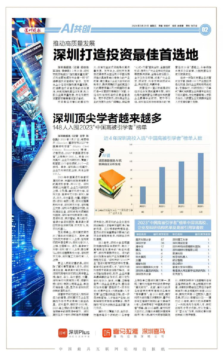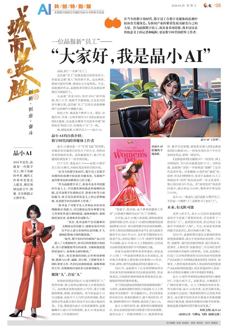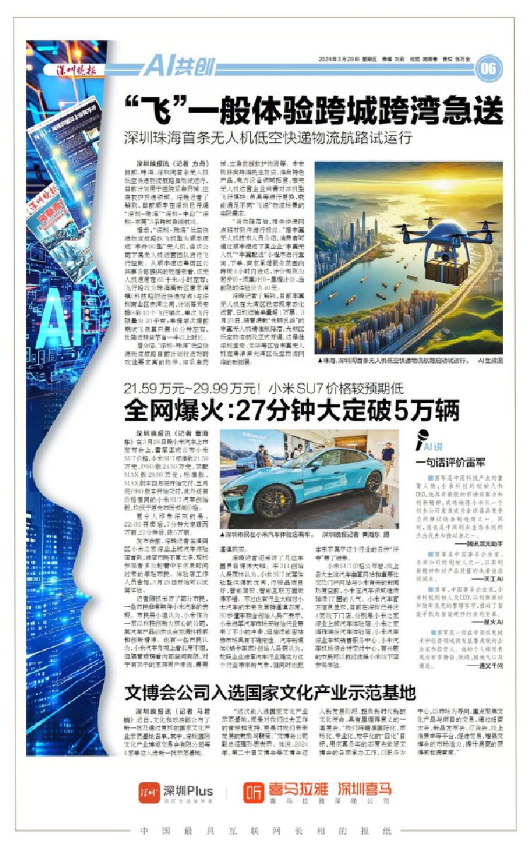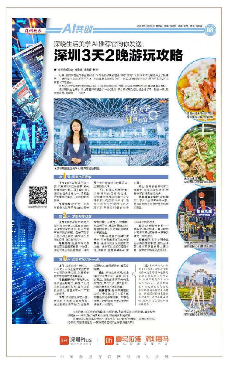 3月28日当天,深圳报业集团旗下的各大报纸,包括深圳特区报、深圳商报、深圳晚报、晶报、Shenzhen Daily、南方教育时报等,分别推出了AI共创的报纸版面。