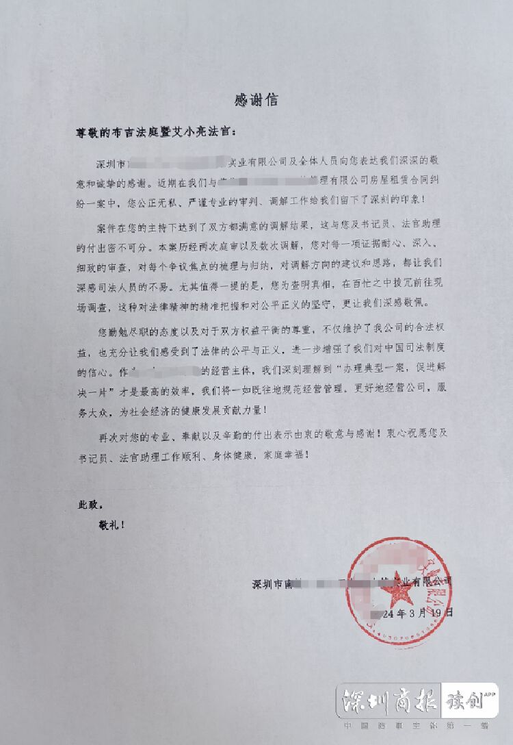 近日,本案双方当事人共同把一面锦旗和一封感谢信送到龙岗法院,称“案件在法官的主持下达到了双方都满意的调解结果”,对法官的“勤勉尽职”表示感谢。