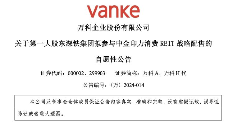3月15日晚间,万科A(000002)公告,深铁集团拟通过战略配售方式认购中金印力消费REIT,认购份额数量为不超过该基金募集份额总额的30%。