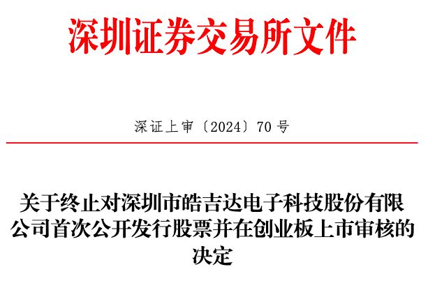 4月4日,深交所公告,终止对深圳市皓吉达电子科技股份有限公司(以下简称“皓吉达”)首次公开发行股票并在创业板上市审核,原因是皓吉达和保荐人中信证券撤回公司在创业板IPO申请。