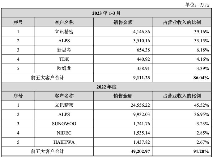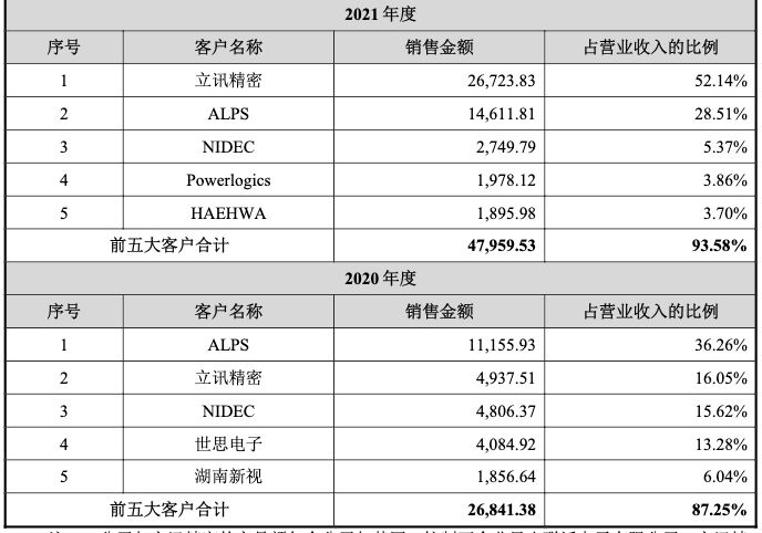 可以看出,公司客户集中度较高。其主要客户包含立讯精密、ALPS等,其中报告期内来自立讯精密和ALPS的收入占比合计分别高达52.31%、80.65%、82.47%、72.31%。