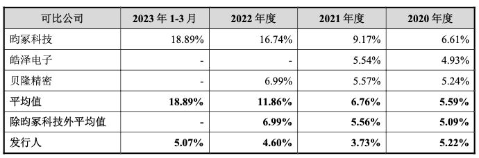 此外,报告期内,皓吉达的研发费用率分别为5.22%、3.73%、4.6%、5.07%,而同业均值分别为5.59%、6.76%、11.86%、18.89%。