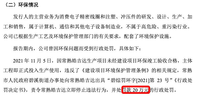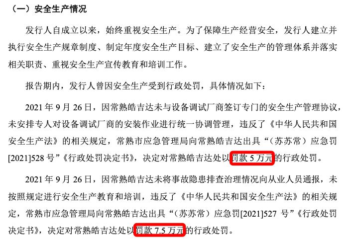 值得一提的是,子公司常熟皓吉达于报告期内曾先后多次因安全生产和环保问题受到行政处罚,合计被罚款32.5万元。