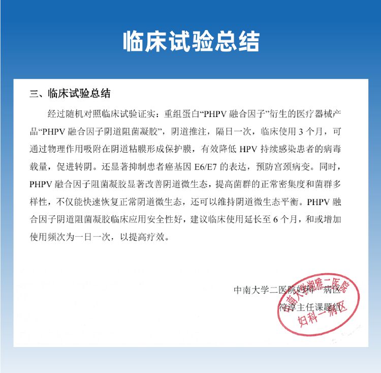 符淳教授课题组历时3年临床研究,于近期完成了试验数据的统计分析报告,数据总结如下:“经过随机对照临床试验证实:重组蛋白“PHPV融合因子”衍生的医疗器械产品“PHPV融合因子阴道阻菌凝胶”,阴道推注,隔日一次,临床使用3个月,可通过物理作用吸附在阴道粘膜形成保护膜,有效降低HPV持续性感染患者的病毒载量,促进HPV转阴,还显著抑制患者HPV E6/E7的表达,预防宫颈病变。同时,PHPV融合因子阻菌凝胶显著改善阴道微生态,提高菌群的正常密集度和菌群多样性,不仅能快速恢复正常阴道微生态,还可以维持阴道微生态平衡。PHPV融合因子阴道阻菌凝胶临床应用安全性好,建议临床使用延长至6个月,或增加使用频次为一日一次,以提高疗效。”