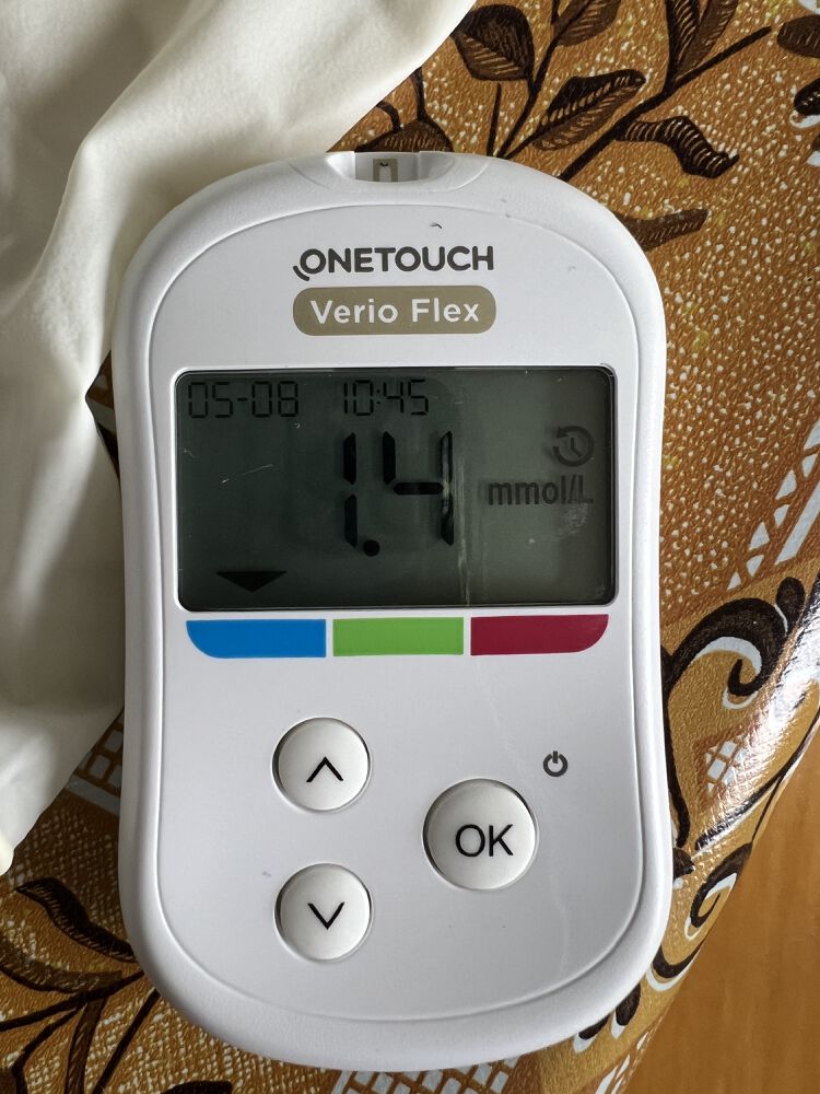 血糖仪监测显示,患者的血糖只有1.4mmol/L,提示严重低血糖。