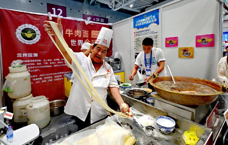 “不是兰州拉面,是兰州牛肉面。”来自甘肃的金味德牛肉拉面传承人周师傅身穿厨师服,为观众现场展示牛肉面制作技艺,他告诉记者,兰州牛肉面,是甘肃省兰州市最具特色的大众化经济面食。兰州牛肉面起源于清代,牛肉汤色清气香,萝卜片洁白纯净,辣椒油鲜红漂浮,香菜蒜苗新鲜翠绿,面条柔滑透黄,色、香、味的完美结合,让兰州牛肉面有了走向全国的底气。