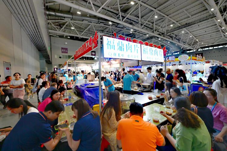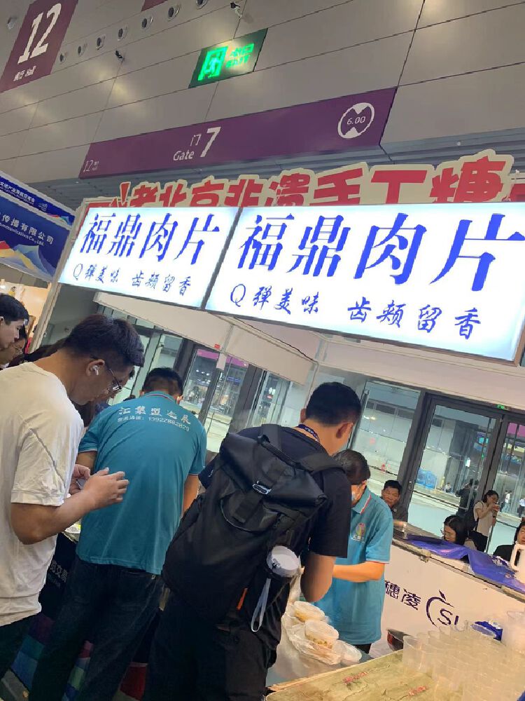 拿起手机,迅速扫场一周,你可以看到琳琅满目的各色招牌:周村烧饼、德州扒鸡、五芳斋粽子、老万成酸梅汤、澳门西洋牛油糕、天水麻辣烫、兰州牛肉面、霍州年馍、山西运城羊肉汤、二利烧鸡、牛庄馅饼、德氏冰淇淋、耒阳刮皮、樟树贡酒、平湖糟蛋、狗不理包子、糖饺子、臭豆腐、怀姜糖膏……这些来自四面八方的非遗美食,带给观众满满的、充满地域特色和幸福感的观展体验。