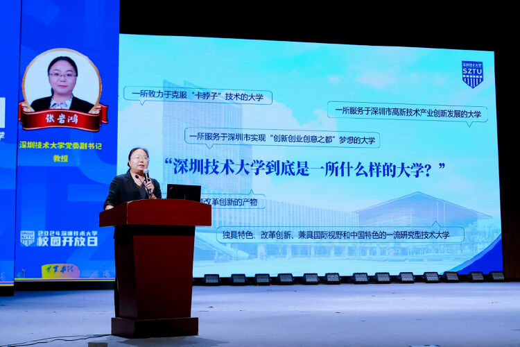 开放日两大宣讲会场分设在学校C-4会堂(物理类专场)和C5公共教学楼(历史类、艺术类专场),深圳技术大学党委副书记、纪委书记张岩鸿,教务部兼招生办主任刘宏伟,各学院院长、副院长、教授,相关部门负责人轮番上场,为考生和家长介绍深圳技术大学,详解招生计划、学院概况、学生就业及创新创业情况等信息,学生代表分享就读体验。