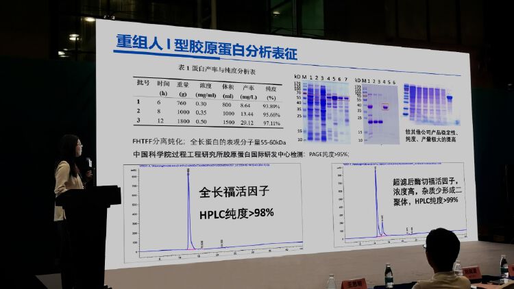 胶原蛋白因其独特的生物相容性和多种功能特性,在医疗和美容领域应用广泛,但其多样性和复杂性也给质量控制带来挑战。中国科学院张贵锋研究员团队通过生物质谱技术,筛选不同类型胶原蛋白的特征多肽,成功实现分子水平溯源。这种高通量质谱定量分析方法,能够准确地鉴定和定量不同种属、亚型的胶原蛋白,能在低至2ng/ml、3ng/g和2ng/g的浓度下,对液体、膏状和凝胶敷料中的胶原蛋白进行痕量检测。张贵锋团队高建萍博士,还展示了中国科学院胶原蛋白国际研发中心对福莱明生物原研创新的福活因子(重组I型人源化胶原蛋白)、融合因子(重组类胶原蛋白)的分析研究,表征结果显示:福活因子不仅PAGE电泳纯度高于95%,HPLC液相色谱纯度更是达到99%以上。